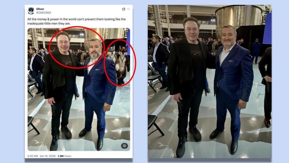Does a real photo show Elon Musk and Ted Cruz posing together while two furries are passing in the background? No, that's not true: A real photo that was posted...