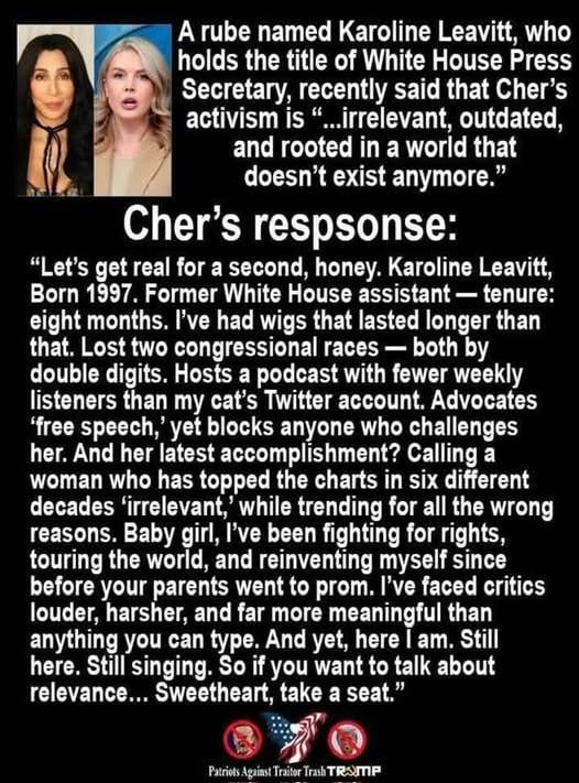 Did Cher tell Karoline Leavitt to "sit down, baby girl" after reading out her bio on MSNBC? No, that's not true: The viral story about the singer reacting to a...